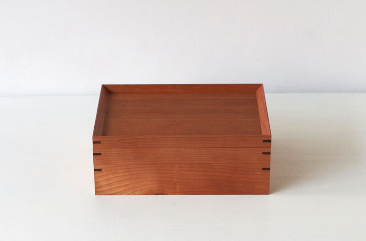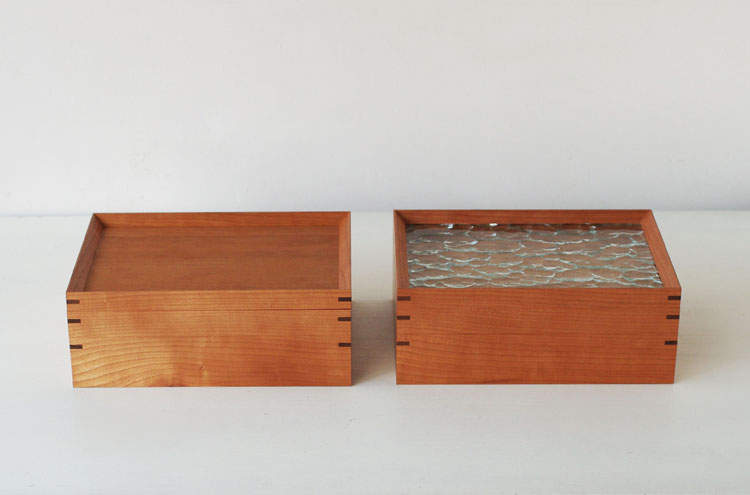 【材質】型板ガラス(蓋)、チェリー(蓋枠、箱本体)、ウォールナット(かんざし※留め継ぎ部分)、オイル(仕上げ)