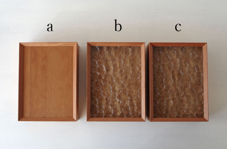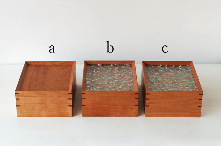 「b」「c」はフランスから仕入れた、レトロな「型板ガラス」をカットし、蓋に組み込んだ、ノスタルジックな印象を覚えるデザイン。