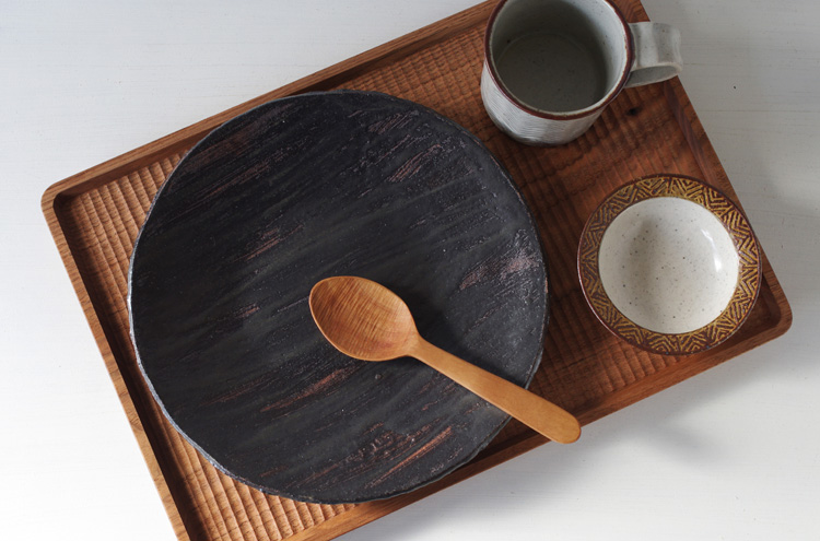 玄釉シリーズは、江口誠基さんの作品。何層にも塗られた玄釉の凹凸。刷毛による塗布が、黒一色ではない立体的なグラデーションを生み出しています。
