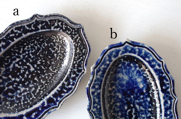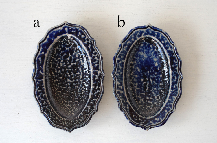 稜花に成型されたリムが印象的な「青ソーダ」は、炊きあがる炎と重曹のあたり方によって異なる青、白、黒の表情が印象的です。