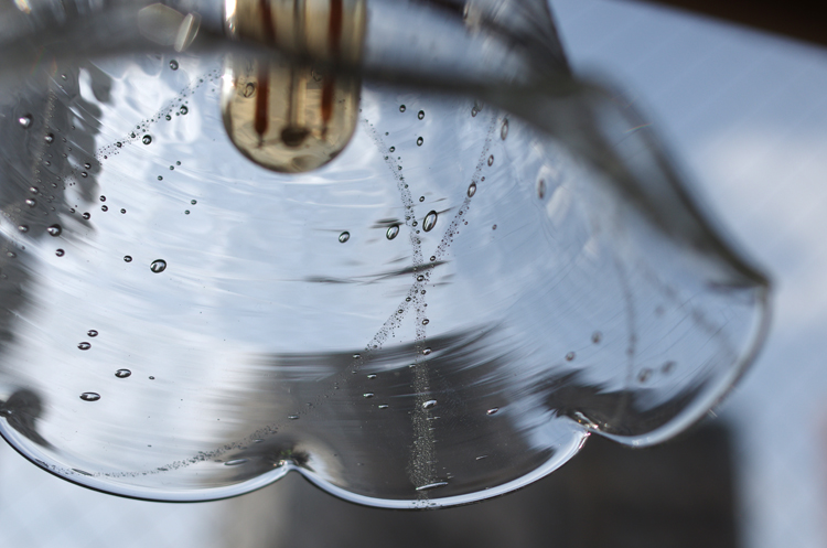 デザインされた泡の筋と不均等な泡が合わさる表情が美しい、ガラスのランプシェードです。