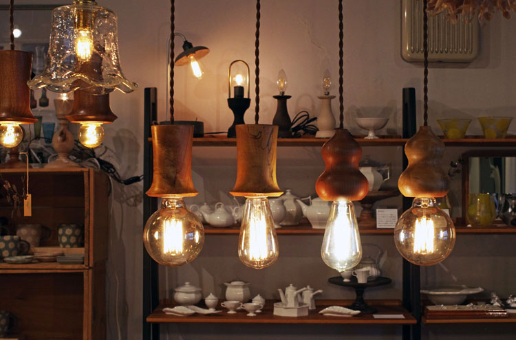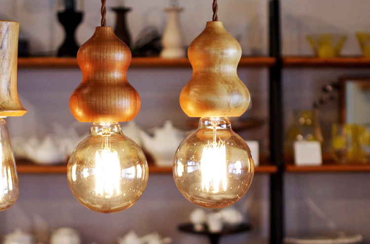 ソケット部分の装飾を「銘木」の表情を楽しめる「国産広葉樹一枚板」の天然木を木工旋盤等を使って手削りで仕上げた、贅沢なインテリアです。