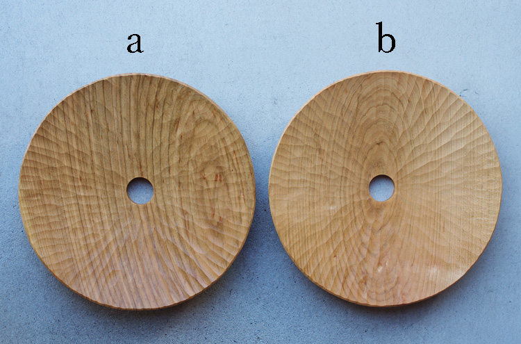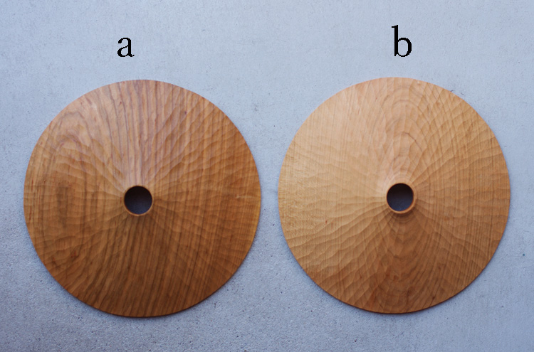 作品の材料に使われている木材の模様(木目)は、性質上、一部に節(フシ)や、葉節(ハブシ)など、特徴のある小さな杢目も見受けられます。